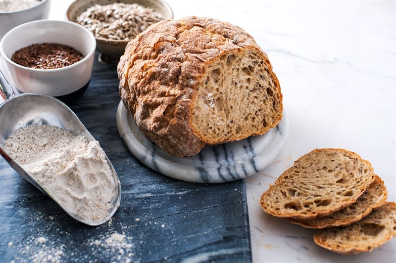 Paine artizanala pe vatra, dospita de trei ori, cu seminte de floarea soarelui, in si susan .