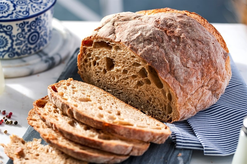 Paine artizanala pe vatra, dospita de trei ori, din faina de grau, secara si germeni de grau.